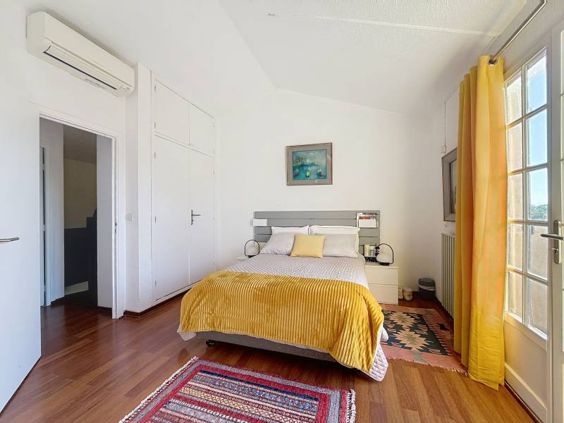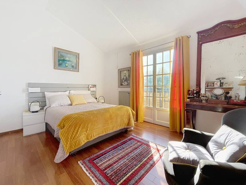 À l’étage, un dégagement dessert une spacieuse chambre avec placard et une très belle hauteur sous plafond donnant accès à une seconde terrasse, également orientée plein sud, une salle de bains avec fenêtre, ainsi qu’un accès aux combles offrant espaces de rangement supplémentaires.