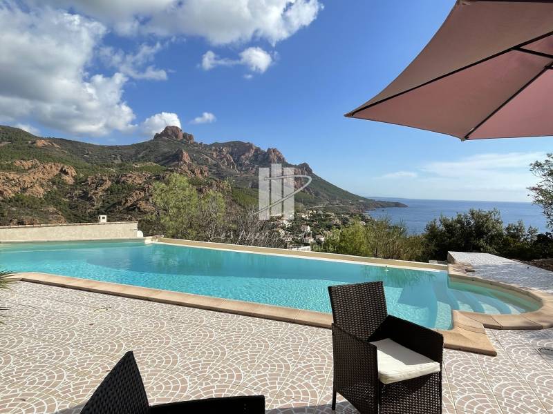 Votre agence Agay Immobilier membre du groupement Les Agences du Sud vous propose à la vente une superbe villa 5 pièces bénéficiant d'une vue mer à couper le souffle nichée au sein d'un domaine prisé et sécurisé. Cette villa des années 1990, d'une surface d'environ 120m² habitables, construite sur un terrain de plus de 1400m² saura vous séduire par son fort potentiel. Une remise au goût du jour est à prévoir. Elle se compose de la manière suivante : un vaste espace de vie avec cheminée, deux jolies chambres, une suite parentale, un dressing, deux salles de bains, une cuisine ouverte, un cellier. Une terrasse de plain pied avec le séjour vous permettra de profiter d'agréables moments en famille. Vous retrouverez un sous-sol à aménager ainsi qu'un un vide sanitaire. La villa bénéficie d'un garage fermé et d'une piscine au sel.