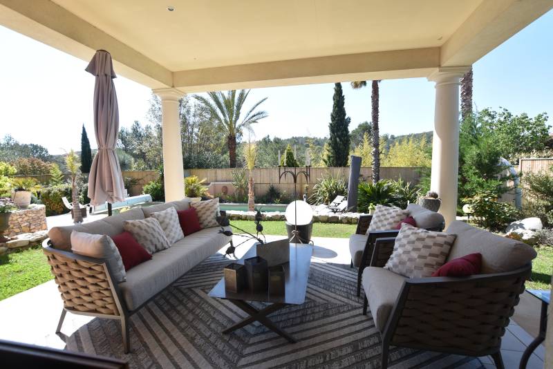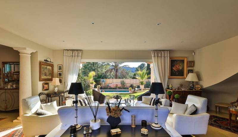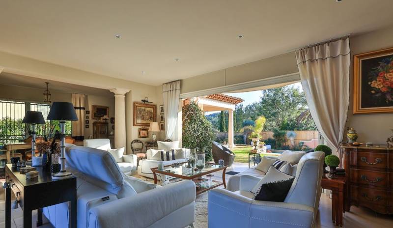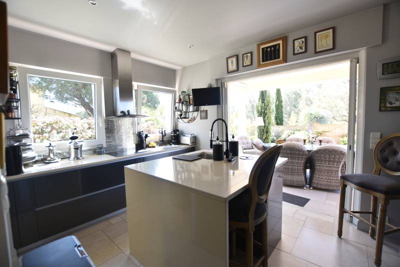 Les Agences du Sud - Côté Demeure Immobilier vous propose cette villa méditerranéenne de caractère. A proximité des golfs de Saint-Raphaël. Cette belle villa néoprovençale de 2007 sur un terrain de 1164m2 de caractère d'une surface habitable de 188m2. Dès l'entrée on découvre une belle pièce à vivre de 90m2 ornée d'un plafond plafond cathédrale vouté. La pièce à vivre offre plusieurs espaces aménagés incluant un salon télé donnant sur une première terrasse. Le salon principal entièrement traversant offre une vue sur la piscine et sur le patio d'inspirations asiatiques. Dans le prolongement, la salle à manger dessert la cuisine semi-ouverte entièrement équipée donnant sur une seconde terrasse aménagée. Au même niveau, une chambre parentale avec salle d'eau privative et dressing. Un bureau pouvant être transformé en chambre ainsi qu'une buanderie complètent le rez-de-chaussée.