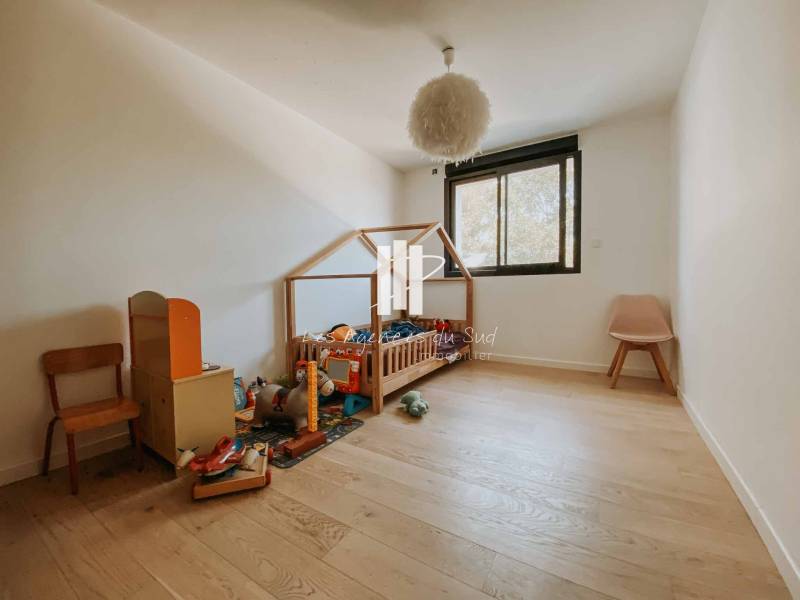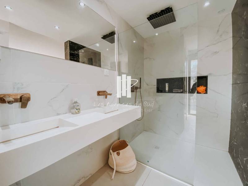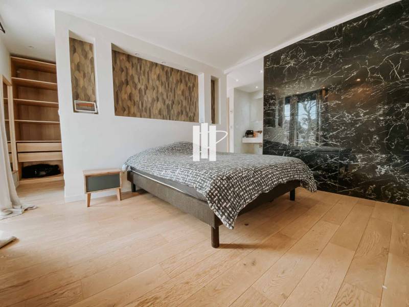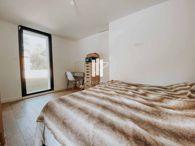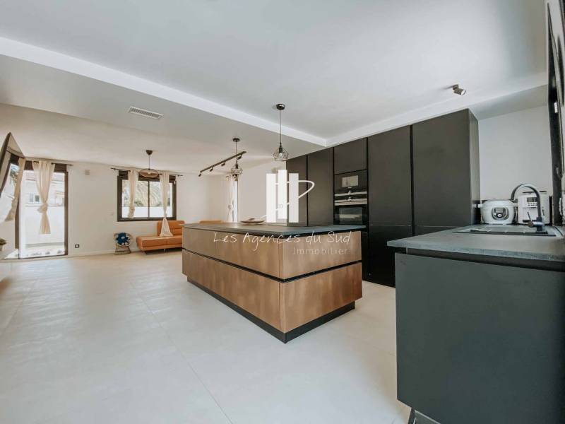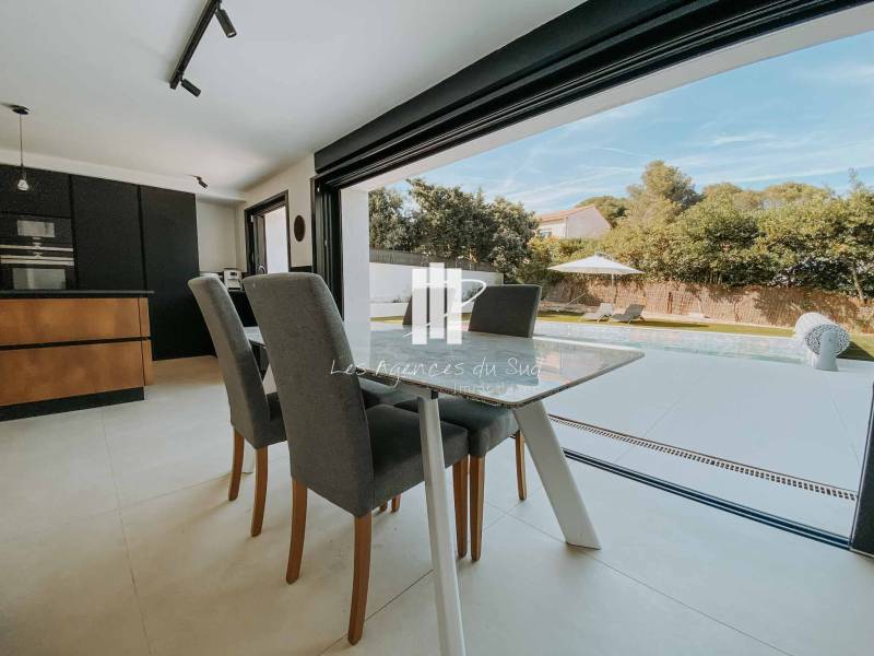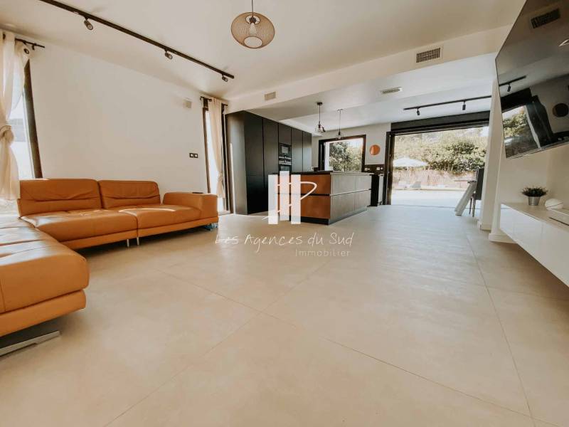 Cette très belle villa se compose de la manière suivante : Une entrée avec de grandes ouvertures offrant une lumière naturelle très agréable, un séjour avec cuisine ouverte de plus de 50m² qui s'ouvre avec une superbe baie à galandage sur une très agréable terrasse ainsi que la piscine, nous retrouvons également de plain-pied une chambre avec sa propre salle d'eau.