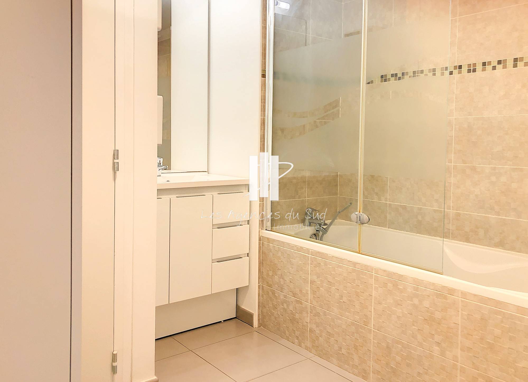 Il comprend une entrée avec une salle de bains, un salon séjour ouvert sur une belle terrasse de 11m² comprenant un jardinet de 8m², une cuisine US entièrement équipée ouverte sur le séjour ainsi que deux chambres et de nombreux placards complètent cet appartement type 3 pièces. W.C indépendant.