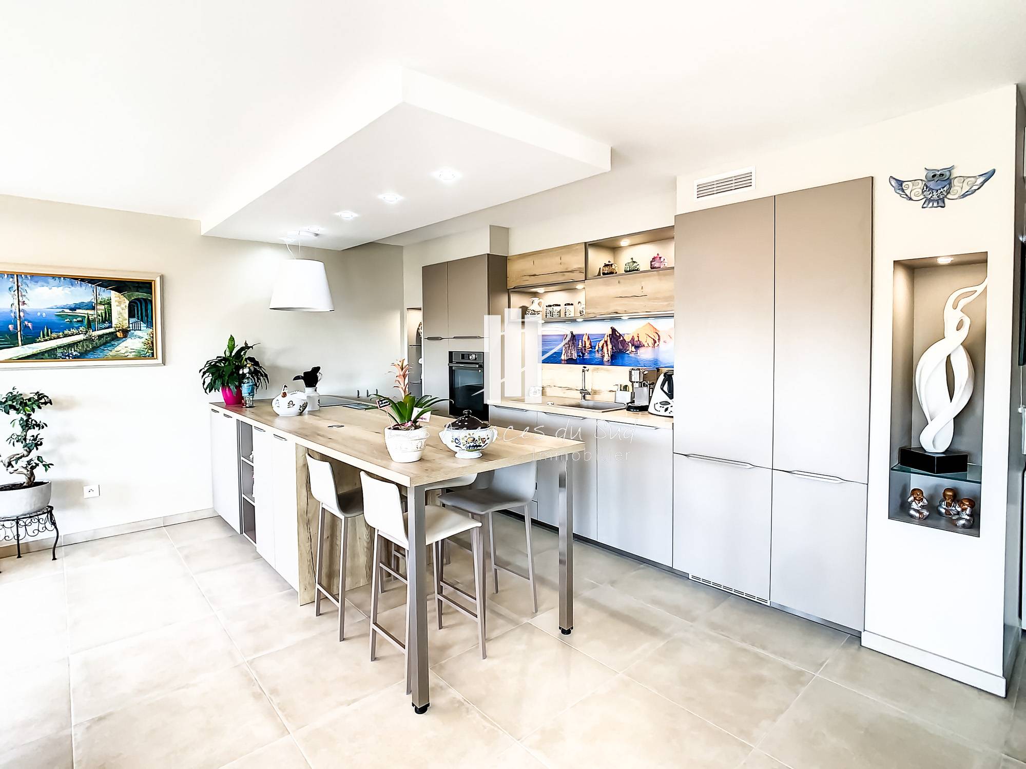 une cuisine américaine entièrement équipée et aménagée, le tout donnant sur une vaste terrasse de 30m², orienté plein sud, offrant une belle vue aérée et dégagée.