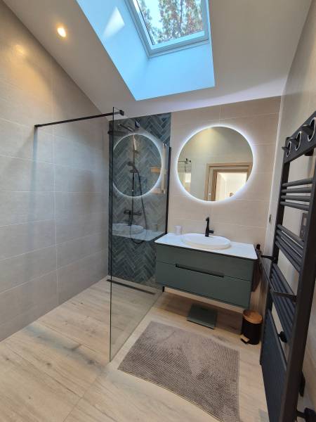 La maison est composée de plain pied d'une entrée, d'une buanderie, d'une pièce de vie de 45m², d'une chambre avec placard, d'une salle d'eau et d'un wc. A l'étage se trouvent 2 autres chambres avec placards une salle d'eau et un wc.
