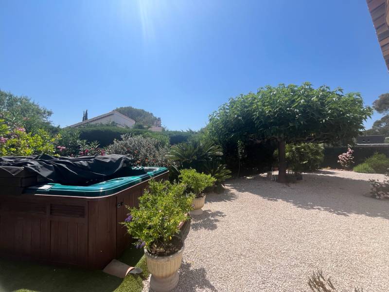 Le jardin paysager, intime et soigneusement entretenu, abrite un spa, parfait pour vos moments de détente à l'abri des regards. Côté pratique, la villa dispose d’un garage attenant avec un accès direct à l’intérieur de la maison, ainsi que d’un carport permettant de stationner un véhicule supplémentaire à l’abri.