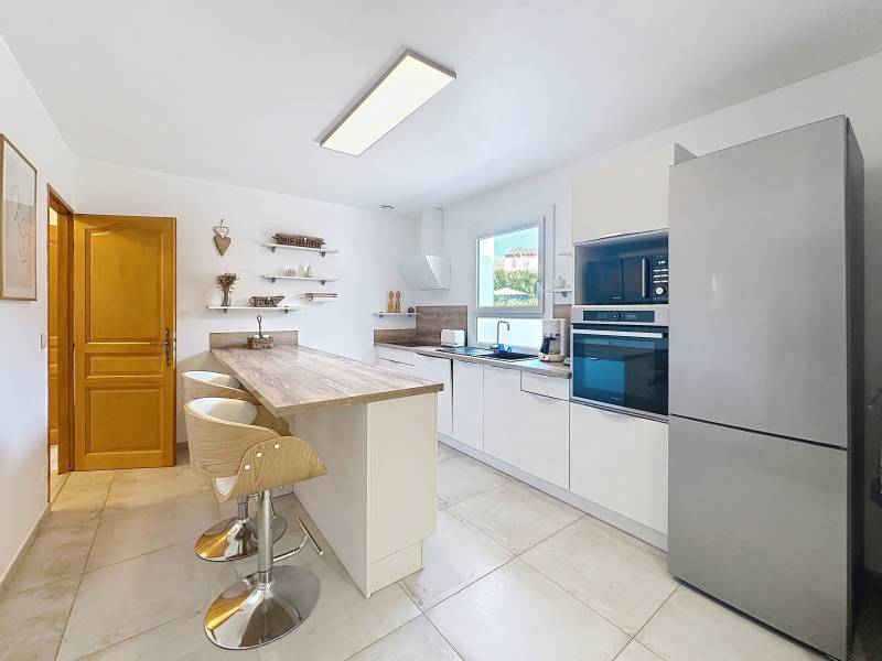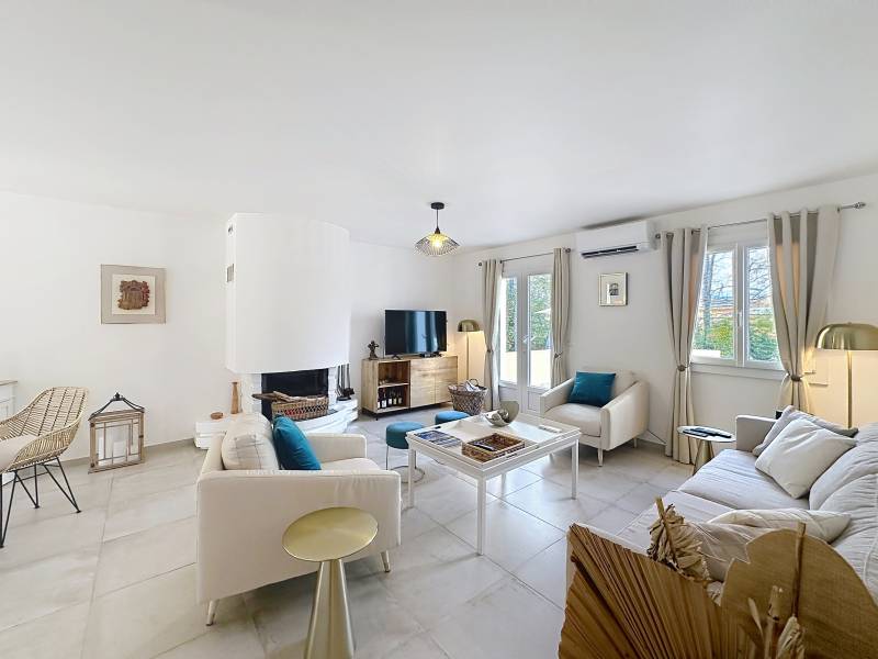 Dès l’entrée, vous découvrez un bel espace de vie lumineux comprenant un salon et un séjour convivial, agrémenté d’un insert cheminée et d’une climatisation réversible pour un confort optimal toute l’année. La cuisine, entièrement équipée et aménagée, s’ouvre harmonieusement sur le séjour, idéale pour recevoir famille et amis.