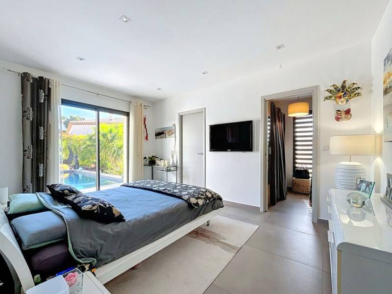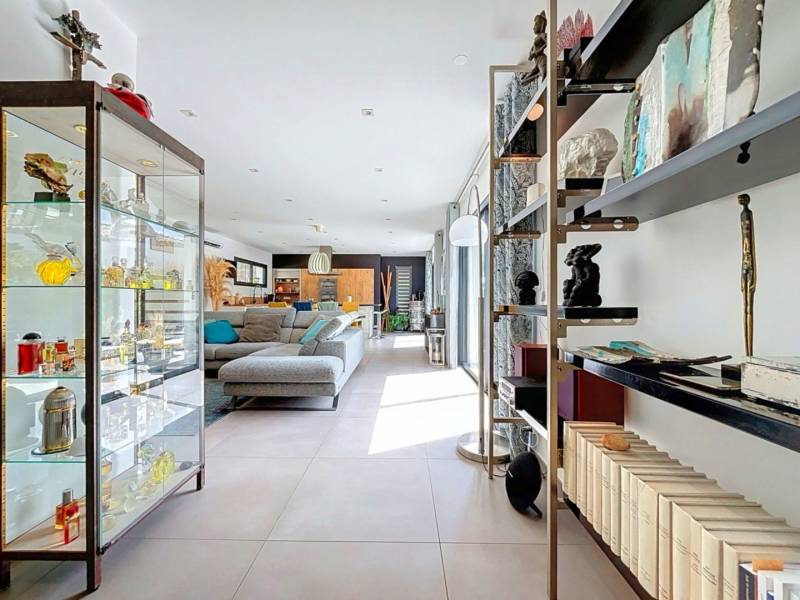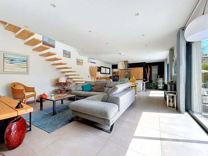 Édifiée sur un terrain paysagé de 708 m², elle développe plus de 172 m² habitables et s’articule autour d’un magnifique espace de vie de 56 m², baigné de lumière grâce à ses grandes baies vitrées à galandage ouvrant sur la terrasse et la piscine. La villa se compose de la manière suivante ; de plain-pied vous trouverez un hall d'entrée élégant, un séjour avec sa cuisine US, une suite parentale de 21m² avec son dressing, salle d’eau et WC, un bureau, une buanderie et un WC invités. L’étage quant à lui, propose un palier distribuant deux belles chambres de plus de 14 m² chacune dotée d’un dressing s’ouvrant toute deux sur un toit terrasse, offrant un aperçu de la douceur de vivre méditerranéenne, une salle d’eau et un WC indépendant complètent celui-ci.