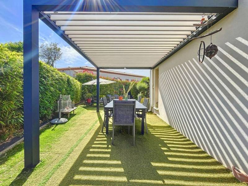 À l’extérieur les aménagements sont pensés pour profiter pleinement du climat azuréen, avec une pergola bioclimatique, une terrasse ensoleillée autour de la piscine, un store ban motorisé et un jardin arboré parfaitement entretenu.